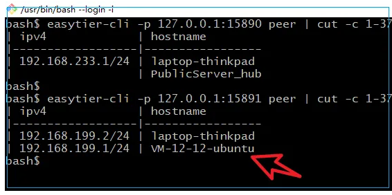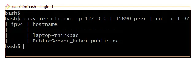 默认使用 easytier-cli peer 命令就可以查看组网状态,当连接了多个虚拟局域网时就需要使用 -p 命令区别不同网络。