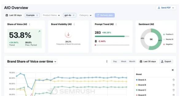 您可以使用Semrush Enterprise AIO或Semrush AI可视化工具包等工具,跟踪生成式引擎优化的进展。