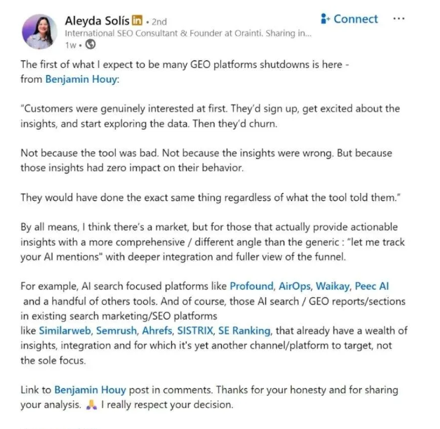 正如SEO出口Aleyda Solís指出的,仅靠工具显示你的品牌在AI回答中的位置是不够的(正如GEO初创公司Lorelight的关闭所示):