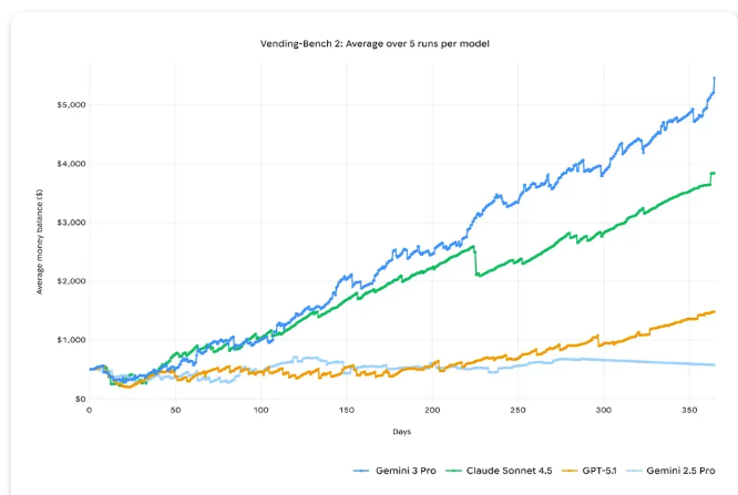 他是让 AI 去经营一年自动售货机,看谁更会做生意,更会长期规划。