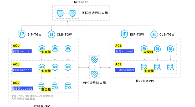 在实际使用场景中,安全组一般部署在 CVM 等云产品边界,用于实现云产品所属安全组间的访问控制。而腾讯云防火墙部署在 VPC 间的边界或互联网边界,用于实现 VPC 间或腾讯云到互联网访问控制。具体如下图所示: