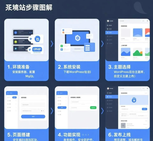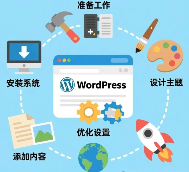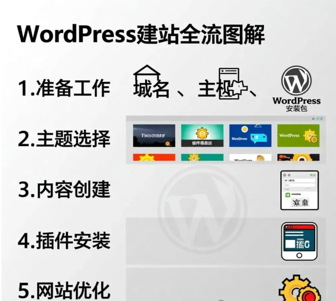 WordPress建站全流程从域名注册、主机购买开始,安装WordPress后选择主题、安装插件,再设计页面布局、添加内容,最后优化SEO并测试发布上线。