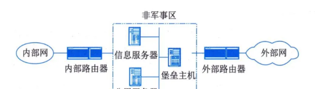 用两个包过滤路由器创建隔离区(DMZ),堡垒主机和公共服务放DMZ中,一个路由器在外网和DMZ间,一个在DMZ和内网间。提供深度防御,即使DMZ被攻破,攻击者仍需突破内网路由器。