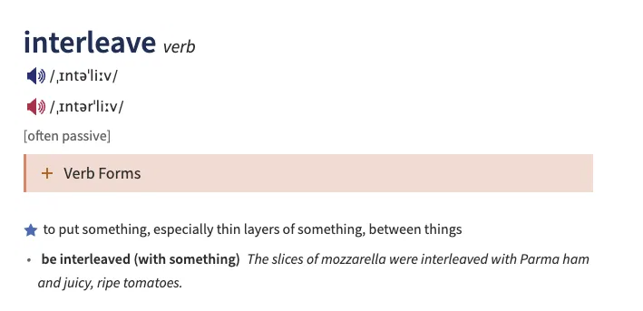 Interleave这个词意思其实很简单,根据剑桥词典的解释,就是在一部分内容里“嵌入”一些内容。