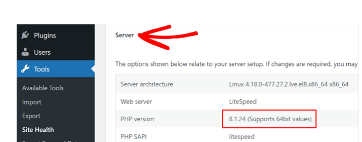 您还可以通过从 WordPress 仪表板转到“工具”»“站点健康”来检查服务器的 PHP 版本。从这里,切换到“信息”选项卡。