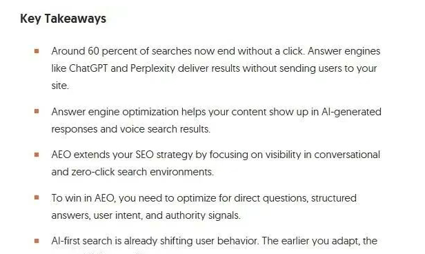 在内容顶部放置简短定义、题目和可扫描部分。这使得您的页面在回答框中更适合提取,并帮助生成引擎准确获取信息。关键收获部分是一个很好的起点:
