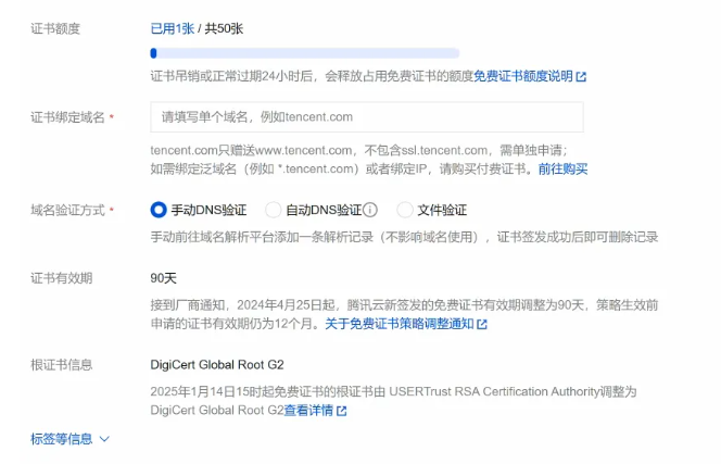 今年买的是腾讯云服务器,赠送 50 个免费 SSL 证书,每个证书有效期是三个月。