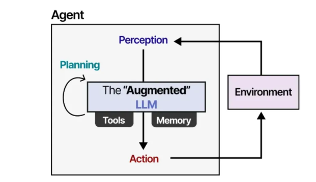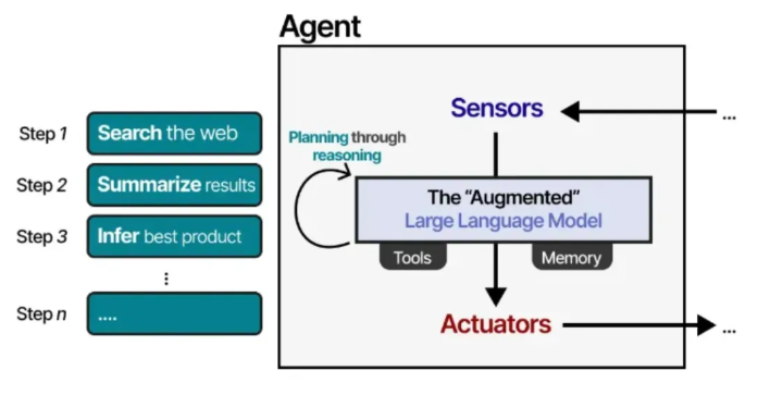 借助“增强型”大语言模型,智能体可以通过文本输入(因为大语言模型本质上是文本模型)来观察环境,并通过使用各种工具(例如网络搜索)来执行特定动作。