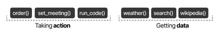 工具通常有两种用途:获取数据以检索最新信息,以及执行操作,例如安排会议或订购食物。