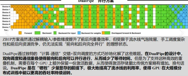 DualPipe优化:实现前向与后向传播同步调度,减少流水线气泡现象,大幅提升多卡并行的资源利用率;