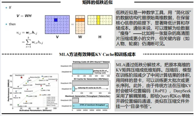 MLA多头隐式注意力:通过低秩压缩技术优化KV缓存,对高维数据进行精准降维提质,在减少显存占用的同时保留核心性能,让长序列数据处理效率提升2-4倍。该技术首次在DeepSeek-V2中引入,是目前开源模型中优化KV缓存的最优方案之一。