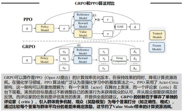 GRPO强化学习:摒弃传统PPO算法的评论家模型,通过群体竞争机制评估输出优劣,在降低显存消耗的同时提升训练稳定性;