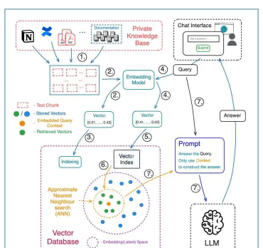 - 检索与生成:将用户查询与向量库匹配,检索相关上下文,与问题一并提交给LLM生成答案。