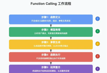 由OpenAI推动的Function Calling技术使LLM能通过自然语言调用外部API,以获取实时数据(如天气、股价等)。其流程包括: