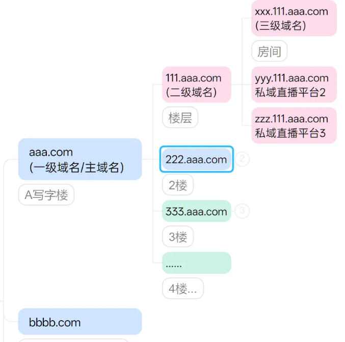 以往如果某个直播间涉及到违规,官方就会封禁对应的三级域名或者二级域名(可以理解为把房间门或者楼层门给锁住了,不让进),那同一个二级域名下(同一楼层)的直播间就会关联影响都不能访问,这样只能给其他直播间切换另外的二级域名继续访问(换楼层)。