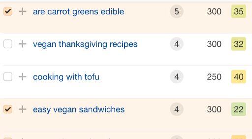 例如,你可以使用关键词难度(KD)仅获取低竞争关键词