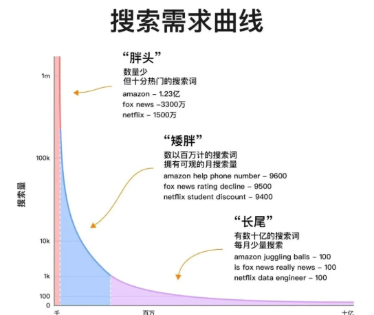 短尾和长尾关键词从“搜索需求”曲线上的位置获得各自的名称