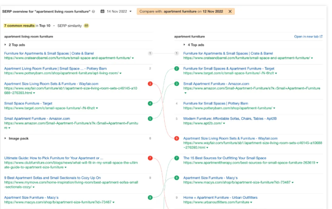 如果我们将“apartment living room furniture”(支撑)与“apartment furniture”(局部)进行比较,我们将在 SERP 中看到七个常见的结果。