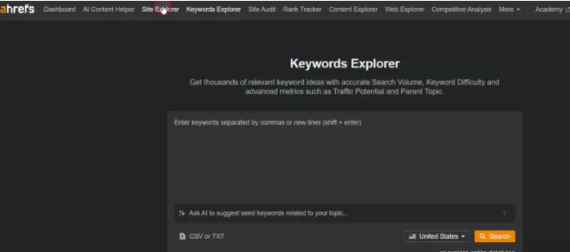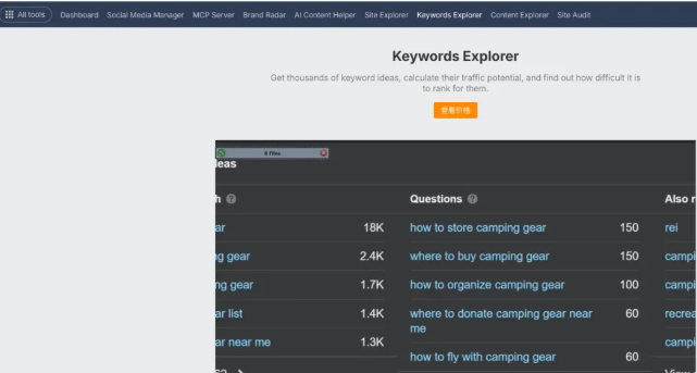 首先我们登录ahrefs网站,然后点击所有工具里面的Keywords Explorer菜单,这个工具是收费的,大家需要购买才能使用。