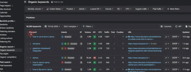 比如流量潜力,是ahrefs通过排名靠前的页面流量来分析的一个TP值,包括也可以看到cpc的付费搜索的数据,所以我们可以通过KD值等这些数据找到相对想做的关键词。