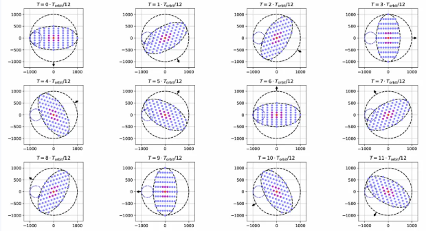 所提议的星座将卫星排列成适合旋转椭圆的模式,沿飞行方向尺寸约为1公里,垂直方向约为0.5公里。这种2比1的比例自然来自支配轨道运动的数学。当星座绕地球运行时,其形状在每次轨道中经历两个完整的压缩和膨胀模式周期,但整体系统保持在可预测的体积范围内。