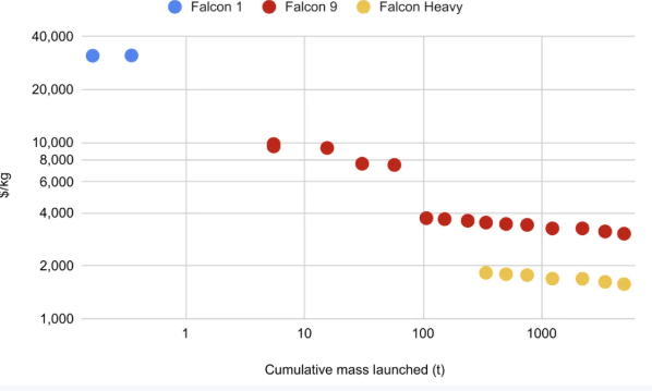 SpaceX实现的成就:每次累计发射质量翻倍,成本降低约20%,涵盖从猎鹰1号到猎鹰重型火箭。每个新型号运载火箭引入时的主要价格不连续性。