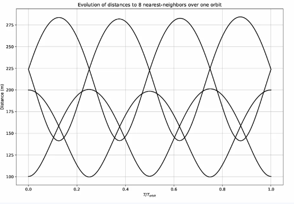 中心卫星与其八个最近邻居之间的距离如何在一个轨道上振荡,在约100米到225米之间变化。这些周期性变化是可预测的,对于维持光通信是可管理的。