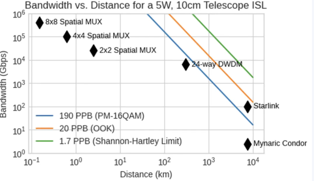 在非常短的距离下,一种称为空间复用的附加技术变得可行。每颗卫星上不是单个光学望远镜,而是可以将多个较小的望远镜排列成阵列,每个建立独立链路,承载自己的复用通道集。随着卫星距离更近,更多并行链路可以适配在相同的总孔径面积内,使总带宽与距离成反比例缩放。谷歌在实验室测试中使用现成组件成功演示了单向800吉比特每秒(双向总计1.6太比特),验证了这一基本方法。