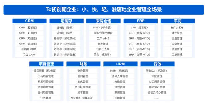 对于初创期企业而言,面临数字化管理需求迫切但IT投资有限的现实约束,零代码平台提供了"All in One 轻量平台"的解决方案,即在该平台上开发所有需要的系统,以"小、快、轻、准"的特点满足企业管理全场景需求。这种一体化的轻量级平台帮助初创企业以最小的技术投入和最短的实施周期,快速建立起基础的数字化管理体系,为业务快速发展提供必要的系统支撑。