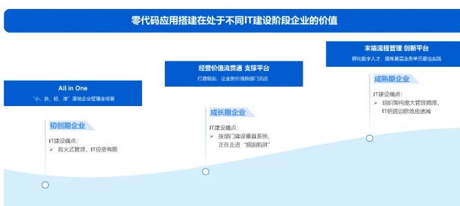 进入成长期的企业,随着业务复杂度提升和组织规模扩大,IT建设开始向系统化和专业化方向演进。此时零代码平台的价值重心转向"经营价值流再造 支撑平台",即提供一个数据贯通的平台,把各个垂直系统给连接在一起。因此低代码平台通过打通组织、让业务价值链前后联动,帮助企业在快速发展过程中保持运营效率和管理协同性。这一阶段的低代码应用更多体现在流程优化和跨部门协作方面。