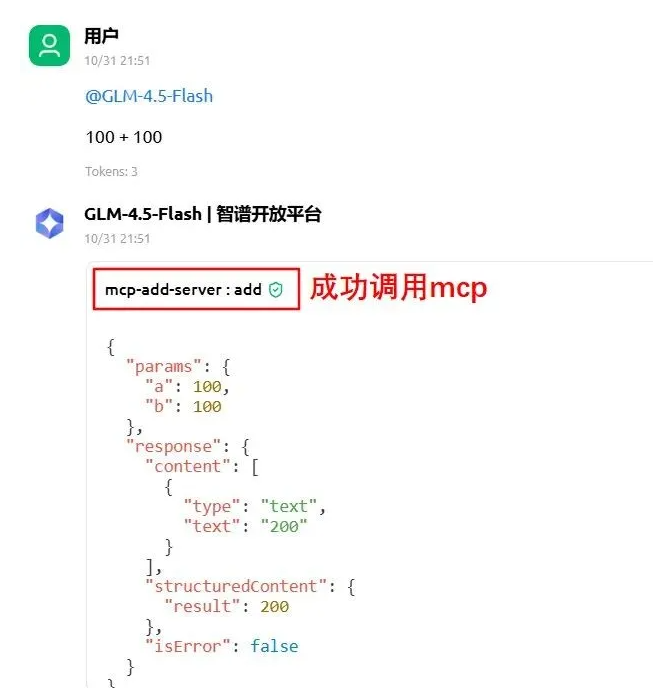 在聊天输入框中输入 100+100,然后查看效果。CherryStudio将通过MCP服务器调用 add 工具并返回结果。
