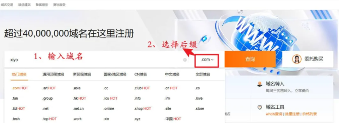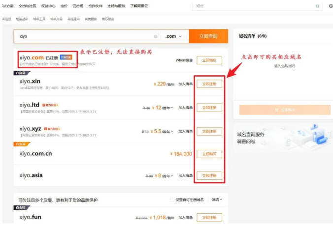 歩棸 3,根据查询结果,购买可以注册的域名,之后按提示完成购买流程即可