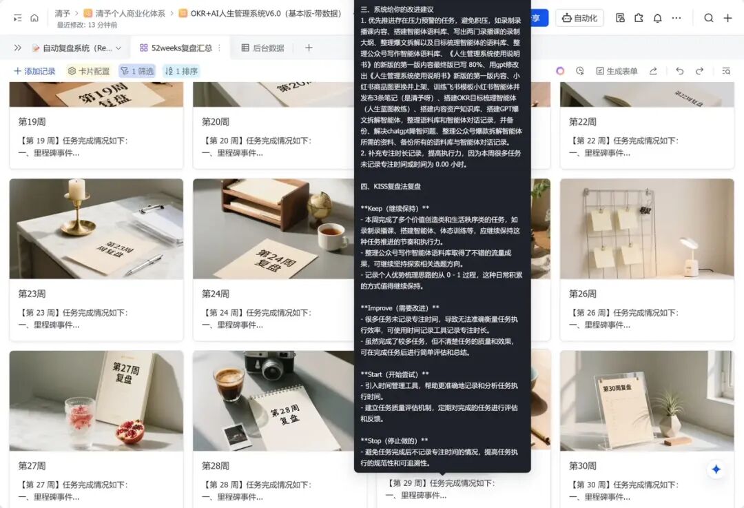 所以,我现在不仅用智能体,帮我将每年的目标拆解成项目、KR、年任务、周任务,我还用系统追踪进展,用AI自动生成复盘报告,辅助我看清自己的盲区。