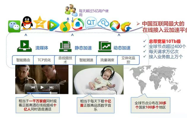给大伙看一下 2015 年腾讯 5 亿日活,集合了音乐,即时通讯等等产品的 CDN 的级别,达到了 10TB 带宽。每天请求万亿次。