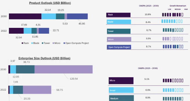 (1)Rack(机架)服务器仍为主力,2030年市场规模预计达724.2亿美元,CAGR高达10.8%;