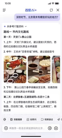 从“找信息”到“完成任务”,这是AI带给百度搜索的质变,也代表了下一代搜索的方向。“我们用AI重构搜索结果页,这不是简单地在搜索结果中插入AI摘要,而是把搜索从以文字内容和链接为主的互联网应用,转化为以图片视频等富媒体内容为主的AI应用。”