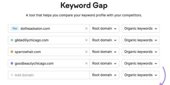 输入您的域名和最多四个竞争对手的域名。该工具提供建议来帮助您。