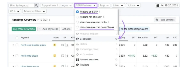 要识别触发本地包的关键字,请转到“SERP 功能”,选择“SERP 功能”旁边的圆圈,然后选择“本地包”。