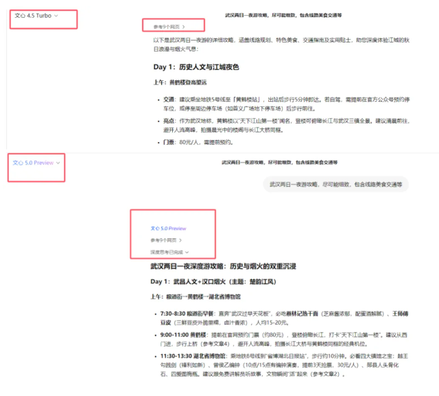 文心大模型5.0 已上线百度千帆平台,用户登录即可调用,但部分能力暂未支持,如视频生成。为了验证,我们进行一个简单的小实操,分别在文心大模型4.5Turbo和文心5.0Preview输入同一个简单指令——“武汉两日一夜游攻略,尽可能细致,包含线路美食交通等”,让我们来看一下结果: