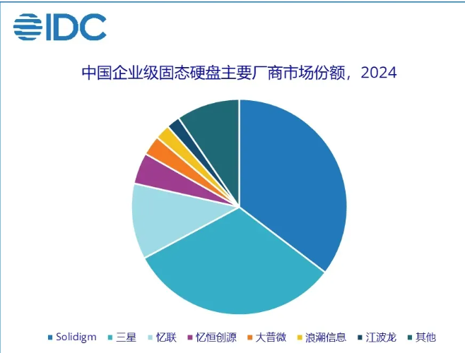 2、SSD品牌情况:市场常见海外品牌有:三星Samsung、思得Solidigm(是SK海力士收购英特尔存储业务后推出的新品牌,是Intel SSD继承者)、美光Micron、西数WD、铠侠kioxia(铠侠前身是日本东芝的存储业务)等;国产SSD品牌有很多常见的有忆恒创源(Memblaze)、忆联(记忆科技与联想共同投资的存储技术子公司)、大普微、得瑞领新,华为等,下面是IDC统计的2024年中国企业级SSD厂商市场份额,供参考;