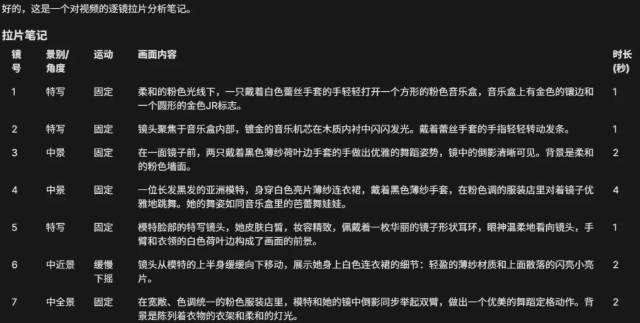 把这段提示词和视频上传好后,直接提交即可。得到具体的拉片分镜描述及视频内容总结,结果如下: