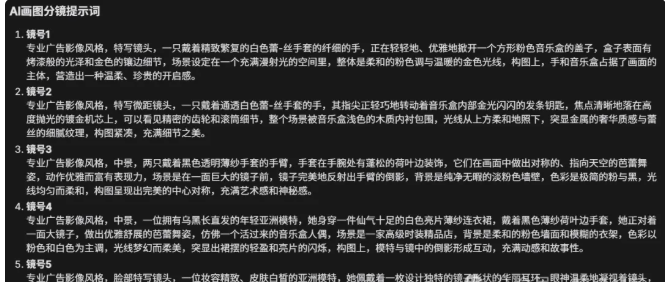 到这里,我们已经通过AI把视频中每一个分镜的画面进行详细的拆解,但还不能直接去用,还需要再次转译成AI生图提示词。