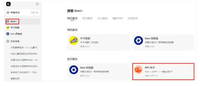在 Kimi+ 中有个 PPT 助手,支持一键自动生成 PPT 内容,而且可以免费下载。