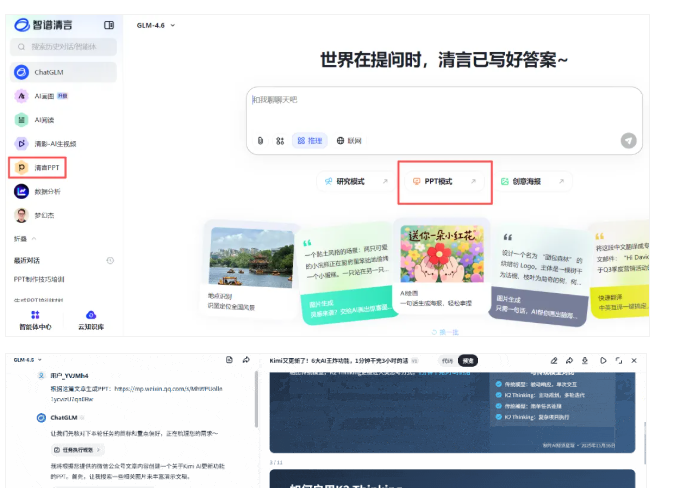 智谱清言中有个清言 PPT,还有个 PPT 模式。