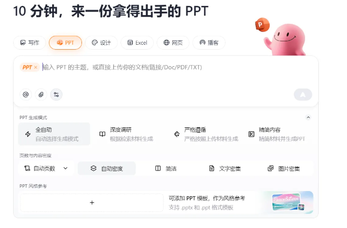 但是,PPT 模式支持一句话生成 PPT、文件生成 PPT、复制微信公众号文章链接生成 PPT。