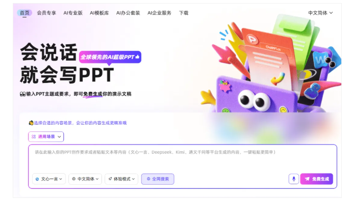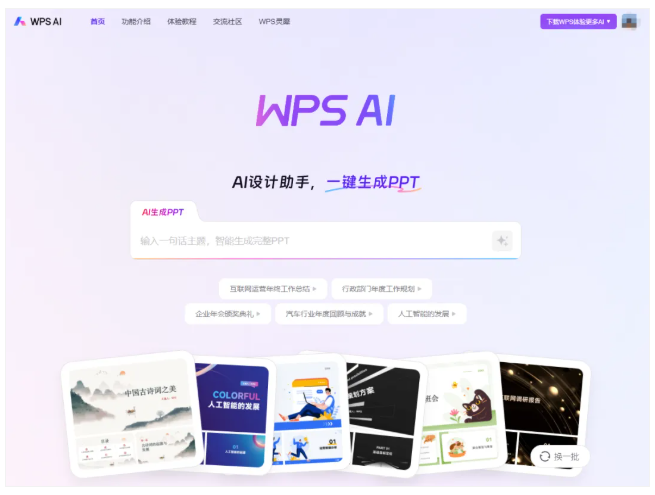 WPS 的 AI 制作 PPT 功能,不用下载安装也可以在线体验,输入一句话即可生成完整 PPT,在线编辑功能强大,使用免费模板可以免费下载。