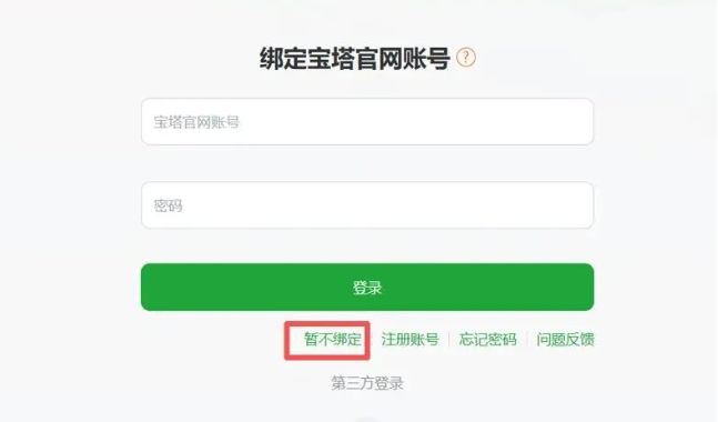 第一次登陆进去后,会显示一个协议,直接拉到最下面,同意协议! 然后出现一个建议绑定宝塔官网账号的画面,如需要可以注册账号并绑定,也可以暂时不绑定,直接点下方的“暂不绑定”(后期可以用手机号注册一个宝塔官网账号并绑定,防止哪天服务器重装面板还能找回))。