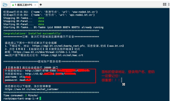 =====================================宝塔外网面板地址 http://你的IP:nnnn/xxxxxxxusername: xxxxxpassword: xxxxxxxxxxxx=====================================以上这些就是你以后登录宝塔的钥匙,丢了就只能重装了!