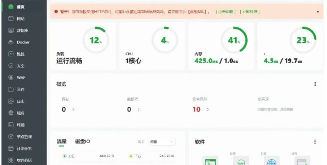 - 点击左侧的【首页】: 你可以直观地看到服务器的 CPU 忙不忙,内存够不够用。看着那条波浪线,是不是瞬间感觉自己也是个专业的运维大神了?