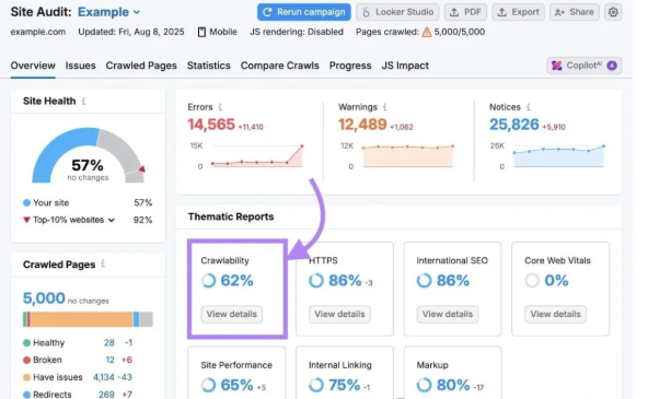 您可以使用 Semrush 的网站审计工具检查您的网站是否有可爬取性和可索引性问题。